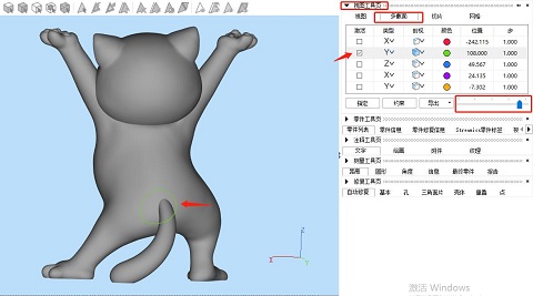 ②在左側(cè)視圖工具頁,選擇“多截面”,類型中即指不同方向軸的截面,當然我們也可以點擊展開后自行選擇別的截面,如3點確定一個別的角度的截面。勾選激活某個截面后,拉動下方的移動軸即可控制模型上的截面的移動。同時我們也可以在“剖視”欄選擇不同的視圖效果,把截面移動至自己需要切割的位置。