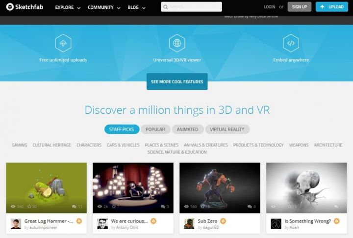 Sketchfab這個3D模型下載網(wǎng)站最主要有一些3D卡通人物及雕塑,每個模型都可以讓你360度旋轉(zhuǎn)欣賞。網(wǎng)站內(nèi)的3D模型相信多達(dá)一百萬個,有些是可以3D打印出來,而有些可能只適合用作製作3D電腦動畫。有時間可以進(jìn)去逛逛,裡面有很多有趣的3D模型。