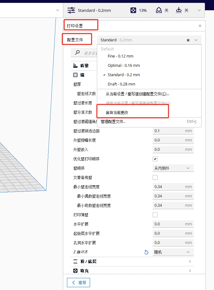 很簡單,您只需在軟件右邊“打印設(shè)置”-“配置文件”中點擊“舍棄當(dāng)前更改”就可以恢復(fù)到默認(rèn)設(shè)置。