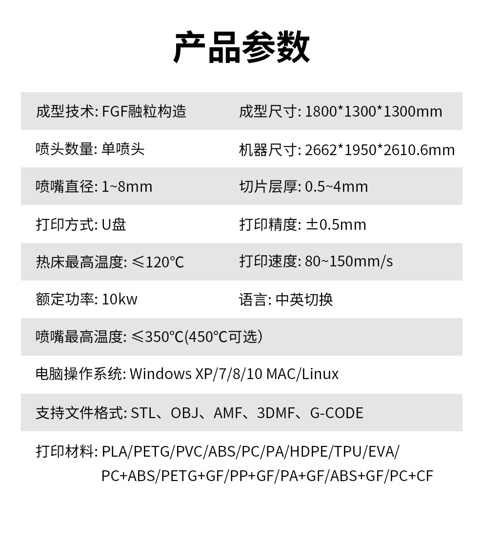 1.8米的超大打印尺寸,適配多種顆粒料耗材,具備更強(qiáng)大的塑造能力